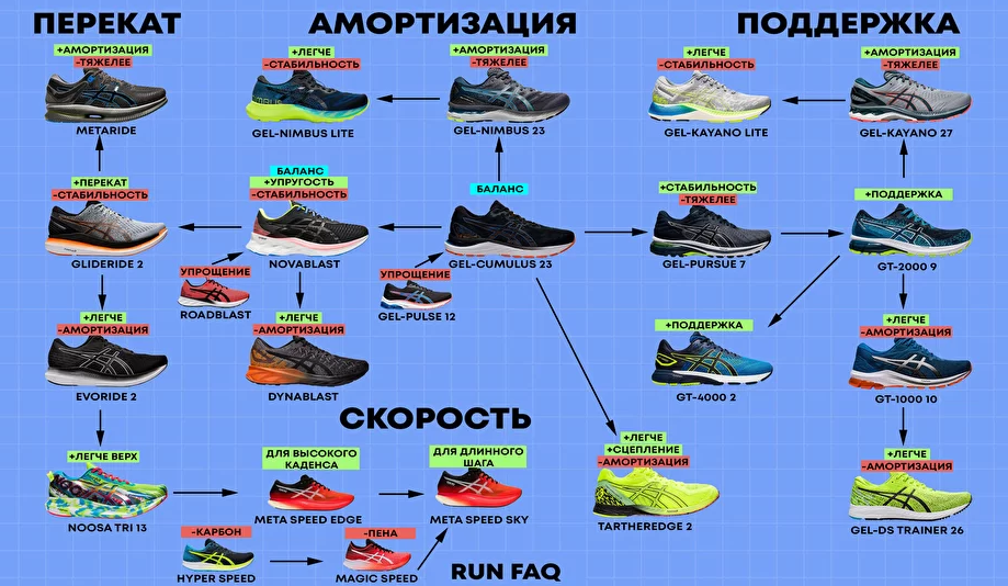 Производители предлагают много разных моделей. Каждый бренд использует свою технологию производства. Asics для амортизации использует гель, Saucony — пену, а Mizuno — пластиковую пластину. Salomon делают кроссовки больше для бездорожья. Все они разные, поэтому давайте разберем каждый бренд более детально.